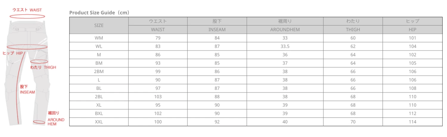 | Size | M, BM, 2BM, L, BL, 2BL, XL, BXL, XXL, WM, WL |
